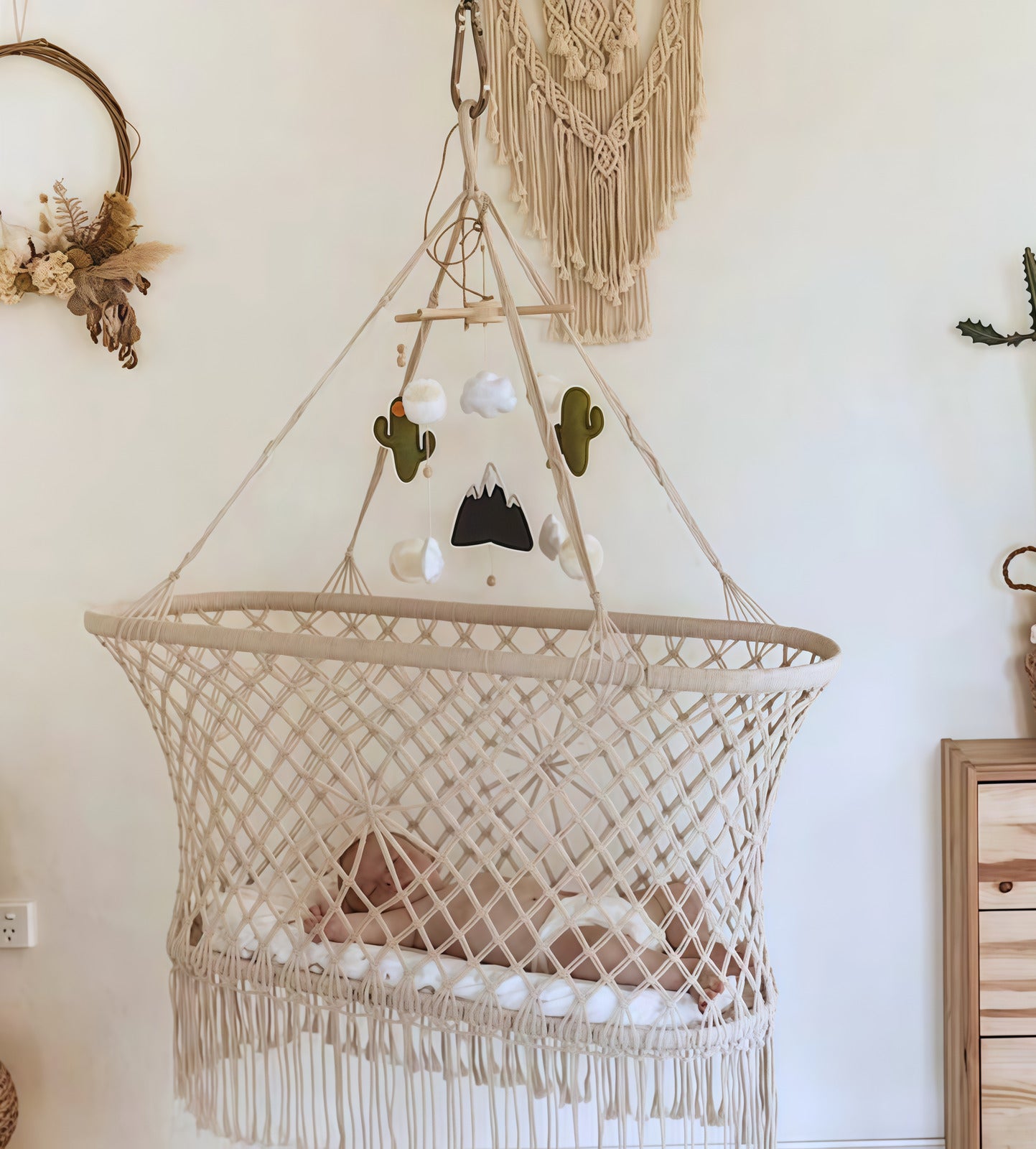 Hang securely using fixed points and ensure proper balance before placing the baby.